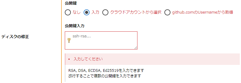 公開鍵は、作成時のフォームに直接入力する、 コントロールパネルにあらかじめ登録しているものを選択 、GitHubのユーザ名から登録済みの公開鍵を取得する…のいずれかの方法より選択可能です。詳しくは ディスク修正機能 のページを参照ください。