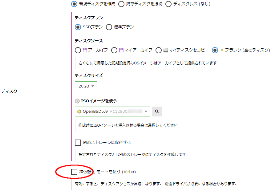 古いOSを使用する必要があり、独自にそのOSのインストールディスクのイメージをサーバの仮想CD-ROMドライブに挿入可能な ISOイメージ としてアップロードしてインストールを行うなどの場合、ディスクがうまく認識しないことがあります。現在さくらのクラウドではディスクの接続に標準でVirtIOが選択されているため、VirtIOドライバに対応しないOSの場合はディスクが認識できなくなるためです。