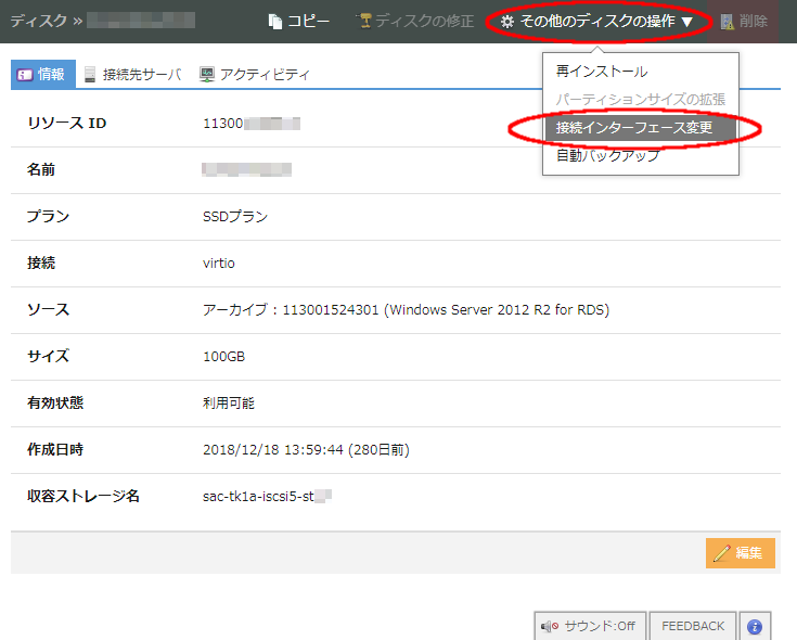 または、ディスクを選択し、上部の「その他のディスク操作」メニューから「接続インターフェース変更」を選択し、VirtioからIDEに変更します。