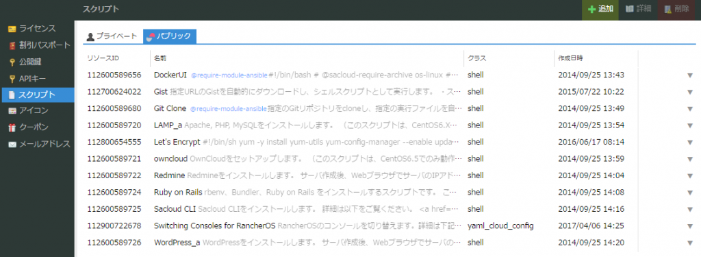 初期状態ではさくらインターネット側であらかじめ作成済みの パブリックスクリプト が表示されますが、ユーザが作成したプライベートスクリプトのリストを表示する場合は、上部「プライベート」タブをクリックして切り替えます。
