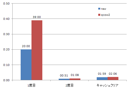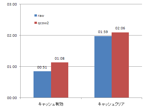 こうして生成したファイルをKVMで実際に使ってみます。同じくフォーマットのテストを実施してみると、1度目は1分58秒、2度目は50秒となりました。2度目終了の後ホストOSでキャッシュをクリアすると1分59秒となりました。これらの結果を先ほどのグラフに追加してみます。