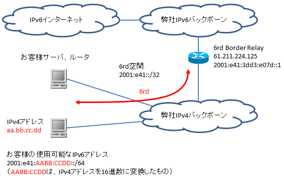お客様がご利用のサーバに6rdの設定を行っていただくことで、弊社IPv4バックボーンよりさくらインターネット研究所が運用する6rd Border Relay(IPv4アドレス 61.211.224.125)を経由して、IPv6インターネットに接続することができます。お客様が使用可能なIPv6アドレスは、現在ご利用中のIPv4アドレスを16進数に変換し、2001:e41:AABB:CCDD::/64のAABB:CCDDの部分に埋め込んだものとなります。