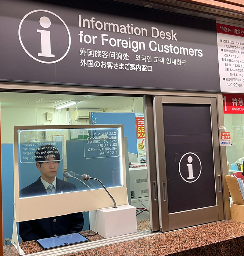 これが導入されたのは、同駅の特急券売り場横にある「外国のお客さまご案内窓口」。翻訳が必要となる煩雑な問い合わせ、英語以外の言語による問い合わせが発生した際、駅係員が翻訳ディスプレイのある窓口に誘導し、円滑なやり取りができる仕組みだ。