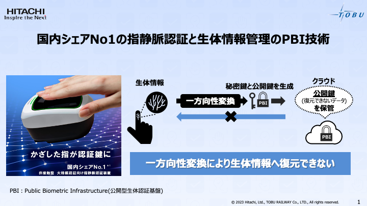 一方で、このプラットフォームを導入した事業者すべてに個人情報が共有されるのかと疑問を覚え、指静脈や顔の情報の盗難リスクについて不安に感じる企業やユーザーもいるだろう。その懸念点を払拭するのが、セキュリティを担保する日立製作所の特許技術「PBI(Public Biometric Infrastructure:公開型生体認証基盤)」だ。