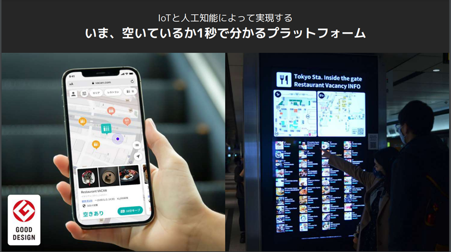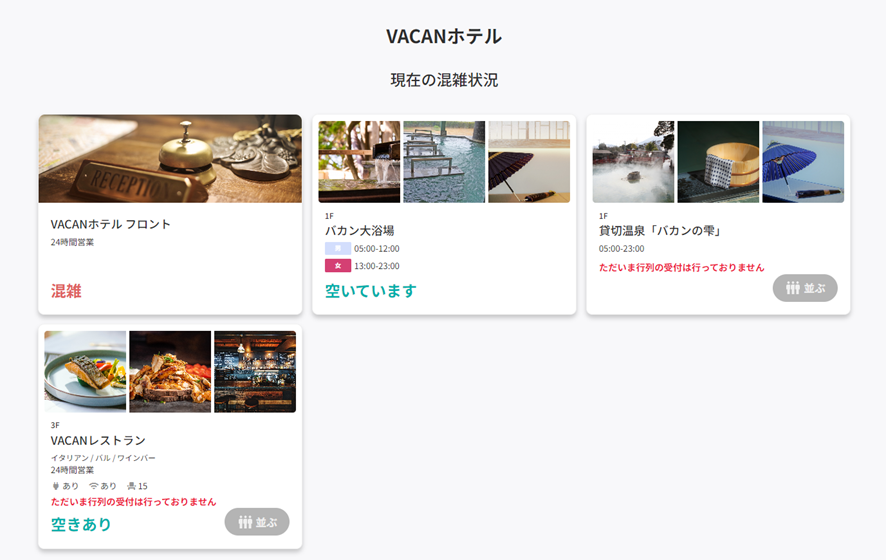 VACANは、センサーやカメラ、タブレット端末などから取得した情報をAIで解析し、リアルタイムの混雑状況に置き換えて、スマートフォンやサイネージなどに表示するプラットフォームだ。ホテル、旅館、百貨店、レストランなど、人が多く集まる場所で積極的に導入されている。