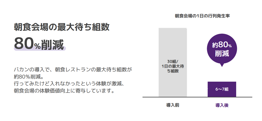 「ビジネスホテルでは、朝食会場の混雑が課題となることが多いんです。朝食を予約する人が少なく混雑が読みにくいのです。さらに、昨今のインバウンド需要の高まりで、観光客がビジネスホテルに宿泊するケースも増加しています。観光客は朝食をゆっくりとる人も多いですから、混雑の一因となっているんです。こうした複数の要因で混雑しやすくなってしまった朝食会場ですが、VACANを導入いただいたあるビジネスホテルでは、最大待ち組数を80%削減することに成功しました」