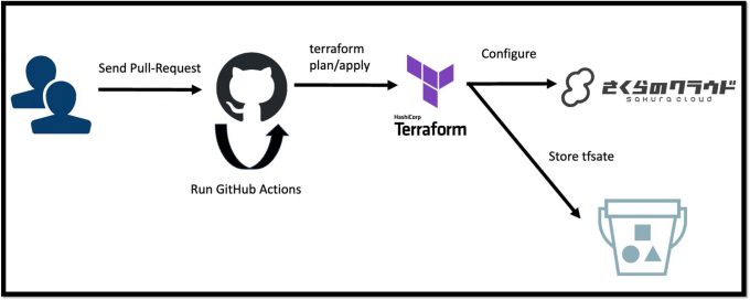 今日発表する内容は、画像で表すと上図のようになります。誰かがPull Requestを送ると、それをもとにGitHub Actionsを動かし、Terraformのplanやapplyを動かして、自動的にTerraform管理下にあるリソースを更新してくれる、そういう仕組みを作ったという話です。