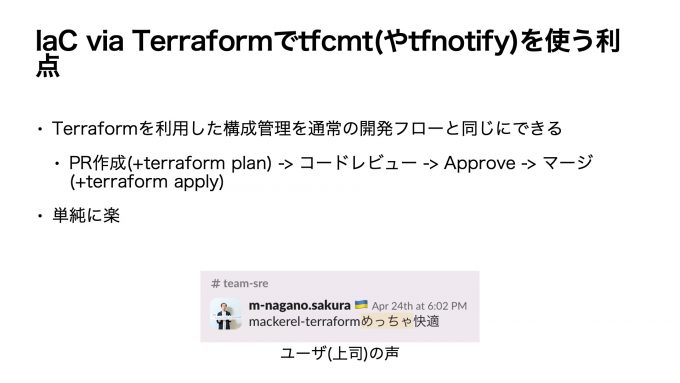 Terraformのplanとapplyをtfcmtやtfnotifyで実行することのメリットとしては、Terraformを利用した構成管理を通常の開発と同じにできるというのがあります。Pull Requestを作ってそれをコードレビューしてapproveした後、マージしてデプロイする、これがあの一連の流れの中ですべてできるというのが大きなメリットです。あと単純に楽というのもあります。実際に使っていてすごく楽で、上司からもそういう声をもらっています。