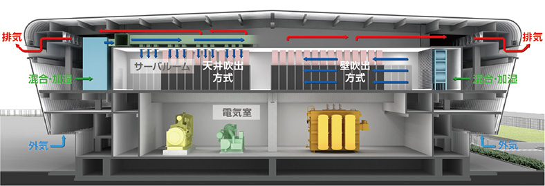 石狩データセンターは、ほぼ通年でサーバルームの外気冷房が可能です。1・2号棟では、北海道の冷涼な外気をサーバルーム内に取り込む「直接外気冷房方式」を採用し、一般的な都市型データセンターと比較して約4割の消費電力を削減。世界最高水準のエネルギー効率を達成しています。現在は3種類の空調方式を採用しており、1つはサーバルームの天井から外気を送り込み、サーバを冷却する「天井吹出方式」。2つめは「壁吹出方式」で、側面に巨大なファンを設置し、外気を壁から室内に送り込みます。サーバの排熱は、天井裏から屋外に排気します(下図参照)。3つめは、ラック列間の通路の区画による「ホットアイルコンテインメント(熱気の囲い込み)方式」で、サーバへの給気(低温)とサーバからの排気(高温)を物理的に分離しています。