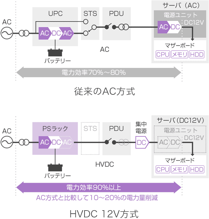 従来のAC方式では、安定した交流電流を確保するためのUPS内部(バッテリーはDC方式稼働)でAC→DC→ACと2度のAC/DC変換が行われています。加えて、サーバ内部の電源ユニットでも再度AC/DC変換が行われ、合計で3度のAC/DC変換が実行されます。変換時には必ず電力損失がともなうため、AC方式での効率は70〜80%にとどまります。
