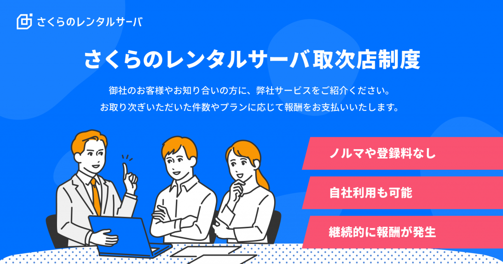 「さくらのレンタルサーバ」を取り扱う事業者に取次店としてご登録いただき、取次店活動(広告、宣伝、販売促進、取次)を通じて、紹介案件が成約に至れば、件数やプランに応じた報酬をお支払いする制度です。
