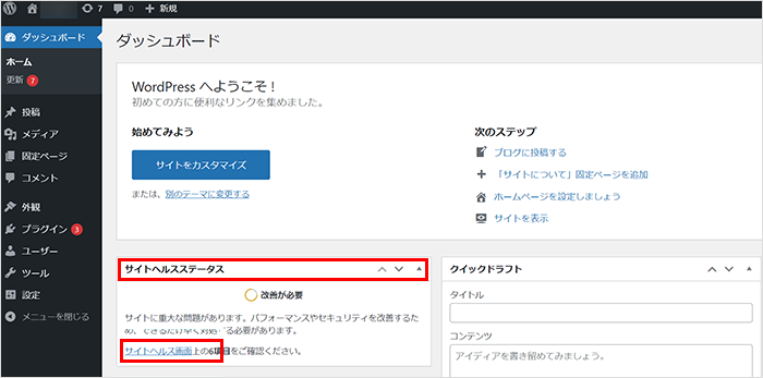 サイトヘルス画面へ移動1ダッシュボード上の『サイトヘルス画面』をクリックします。