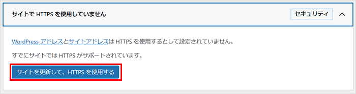 3『サイトを更新して、HTTPSを使用する』というボタンが表示されます。ボタンをクリックするとHTTPS化が実施されます。※ボタンが表示されていない場合は、SSLの設定が完了していません。 本ページ冒頭の準備欄を参照の上、SSL設定を完了してください。 ※ドメイン設定などをした直後は、ボタンが表示されない場合があります。しばらく時間をおいてサイトヘルス画面を再読込してください。