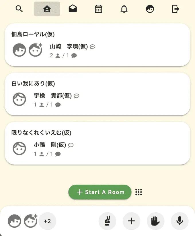 ログインができたらあとはコツコツ1ページずつ、必要なUIとAPIを実装します。Clubhouseのアプリを参考にそれっぽいUIをマテリアルデザインアイコンで作ってみました。