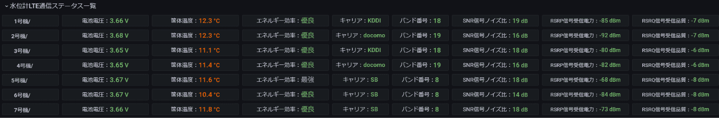 LTE通信のステータス情報を一覧にすることで、装置の状態を監視することもできます。時間帯によって電波状況が変わる様や、気温による水位への影響などの傾向も見て取れます。