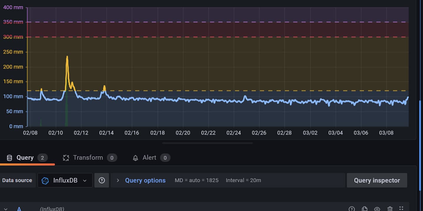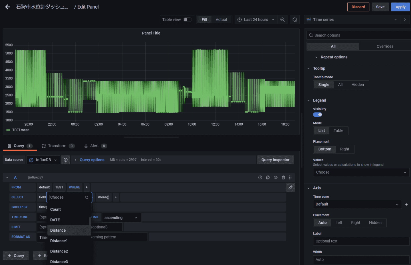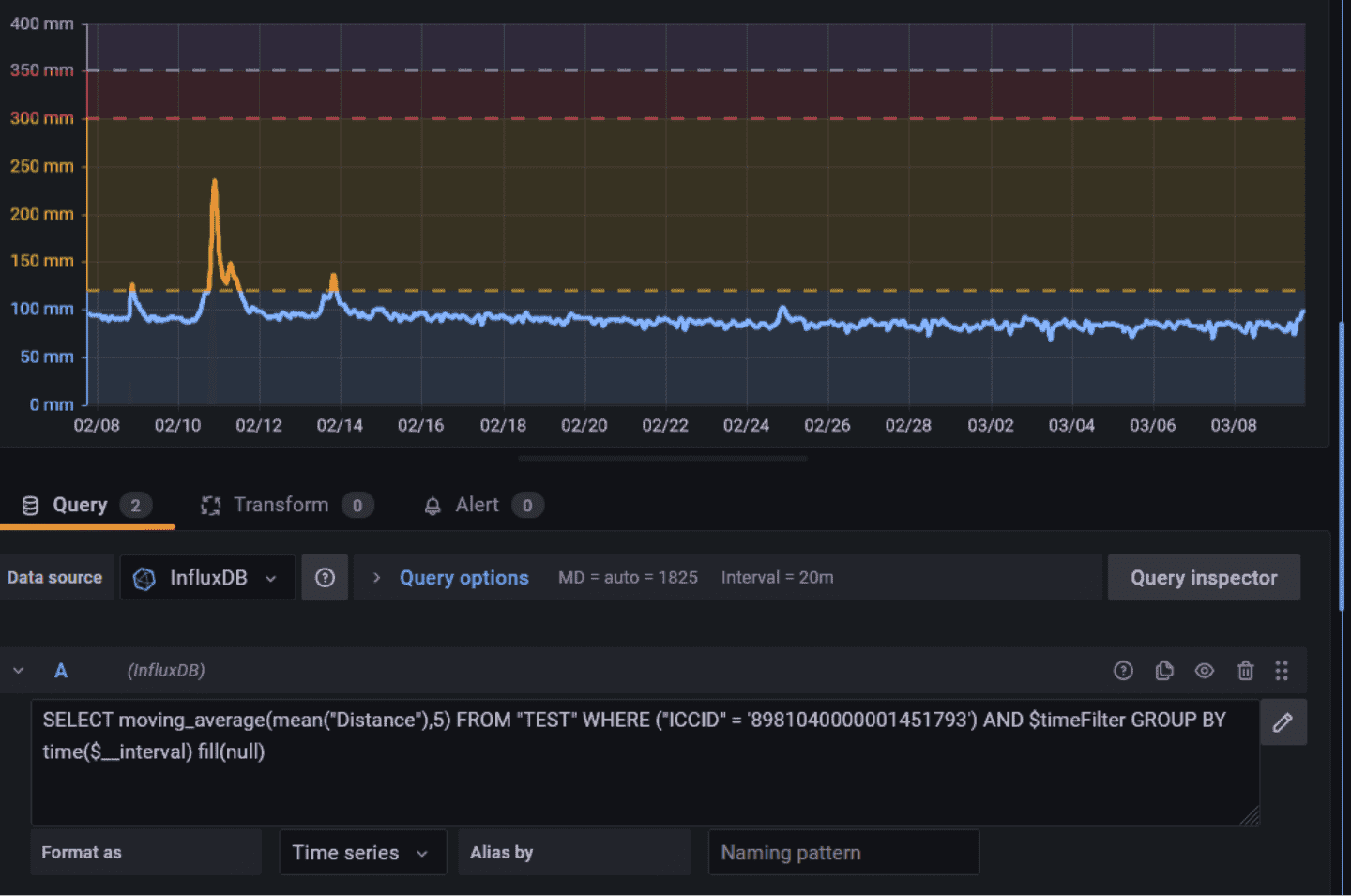水位計は計測値の他にICCIDを送信しています。今回はICCIDをユニーク番号として機体の識別に使用しています。クエリでICCIDをWHEREに指定して個別の水位計の数値を取得します。また、この段階で移動平均などの関数を適用することもできます。