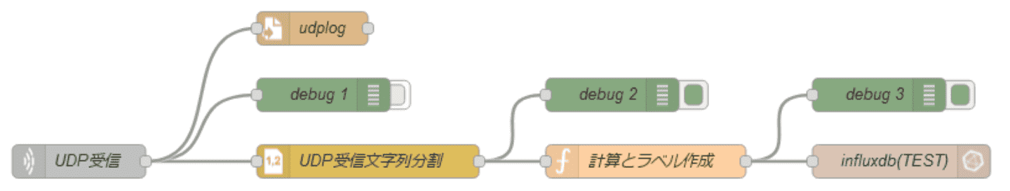 水位計-モバイルゲートウェイから送られてきたデータをNode-REDで受けて、各種処理を行ってからInfluxDBに格納します。測定値の平均化や外れ値の排除など、ほとんどの計算は【数値計算とデータベース格納データ作成】のファンクションで処理しています。
