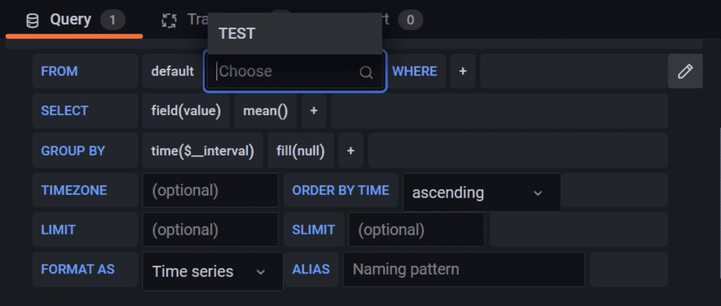 InfluxDBにデータが格納されていてデータソースの設定が正しく行われていた場合は、クエリ作成ウィンドウのselect measurementをクリックすると、データベース名が選択できます。