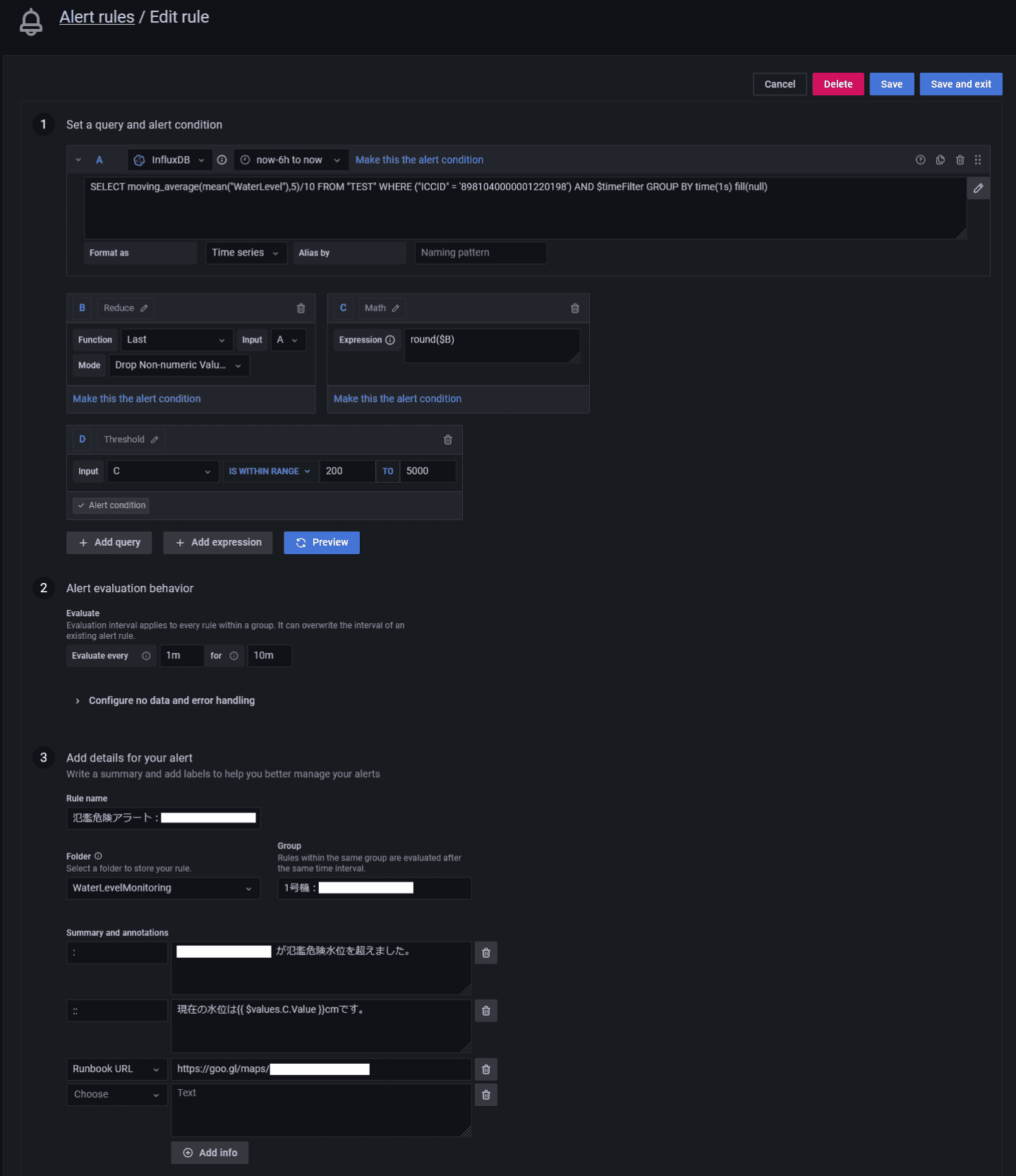 グラフの描画で扱うクエリ文でアラートを設定することができます。水位計測値が警戒水位の範囲に入ったとき、アラートメールを送信する仕組みです。この画像は、最後の計測値が指定範囲に10分以上入っていた場合にアラートを上げるという設定例です。