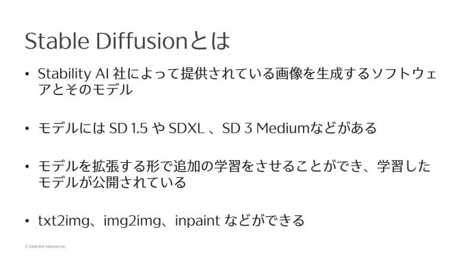 そのモデルには、Stable Diffusion 1.5(SD 1.5)のモデルとか、SDXL(ちょっと質が良いというか解像度の高いモデル)、それから最新のものでは、Stable Diffusion 3 Mediumというモデルもあって、ソフトウェアとモデル両方がStable Diffusionと呼ばれています。