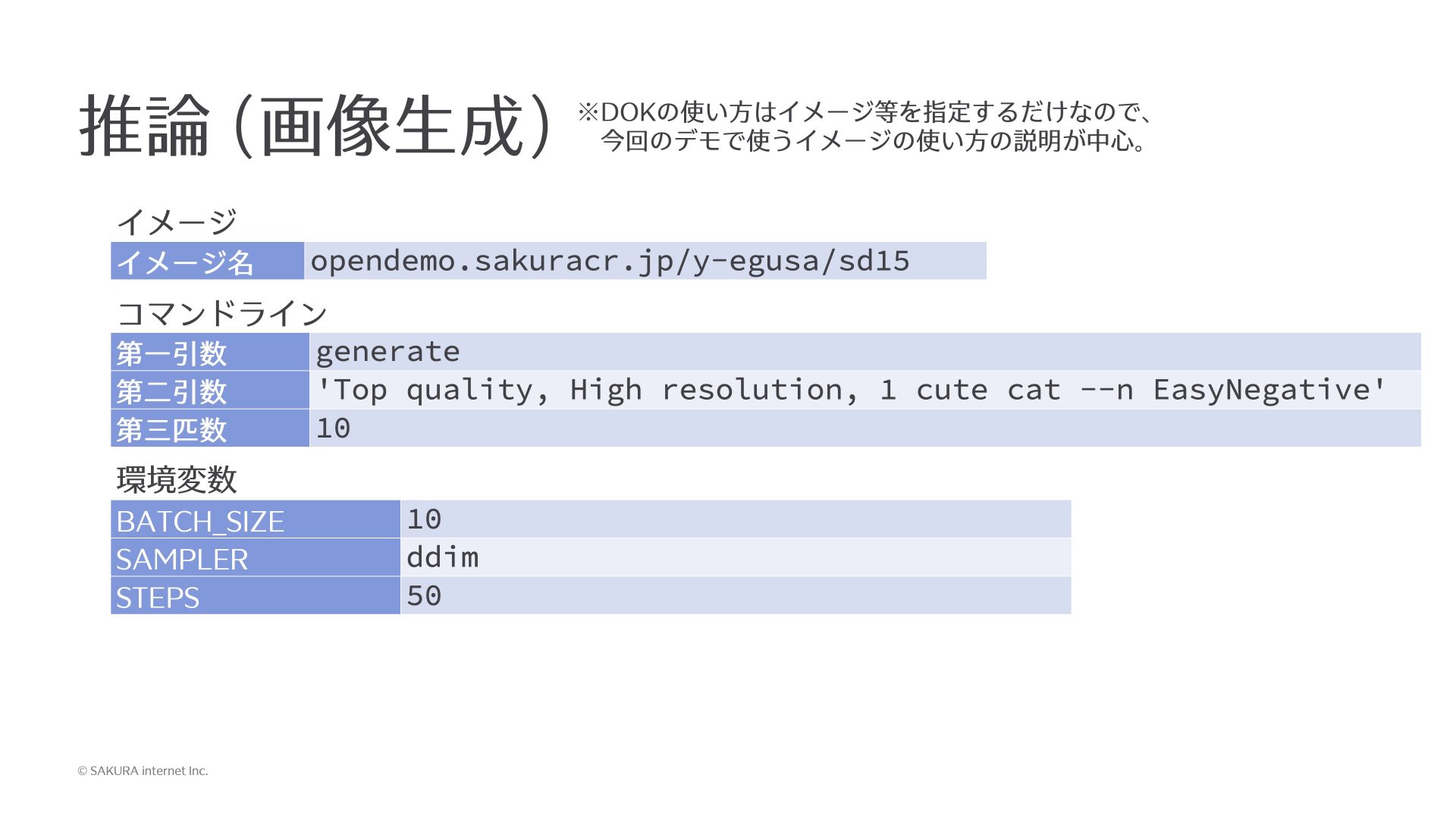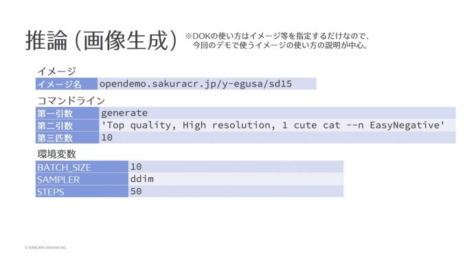 この高火力 DOKを使って、先ほど作ったDockerイメージで推論をしてみます。これはあくまでも今回作成したイメージの使い方なので、皆さんが使うときは引数や環境変数を実際に自分が使うイメージで置き換えていただきたいんですが、今回のイメージでは第1引数にgenerateを渡して、第2引数にプロンプト、第3引数に枚数を指定します。さらに環境変数で一部のパラメーターが設定できます。このようなシェルスクリプトになっています。