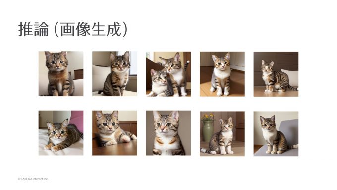 これが学習ですが、学習結果そのものを見ることはできないので、学習したらもう一度生成してみます。生成のしかたは、先ほど猫の画像を生成したときと同じです。