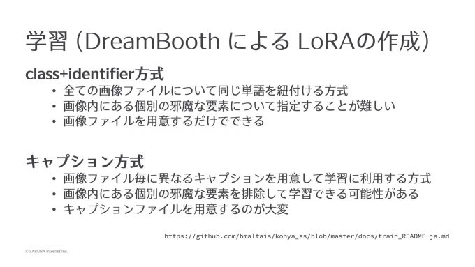 その作り方にもいくつかあって、上記のスライドはsd-scriptの学習方法に関するREADMEから抜粋しまとめたもので、詳しくはリンク先を見ていただきたいんですが、今回そのうちの簡単なもの2つを紹介したいと思います。