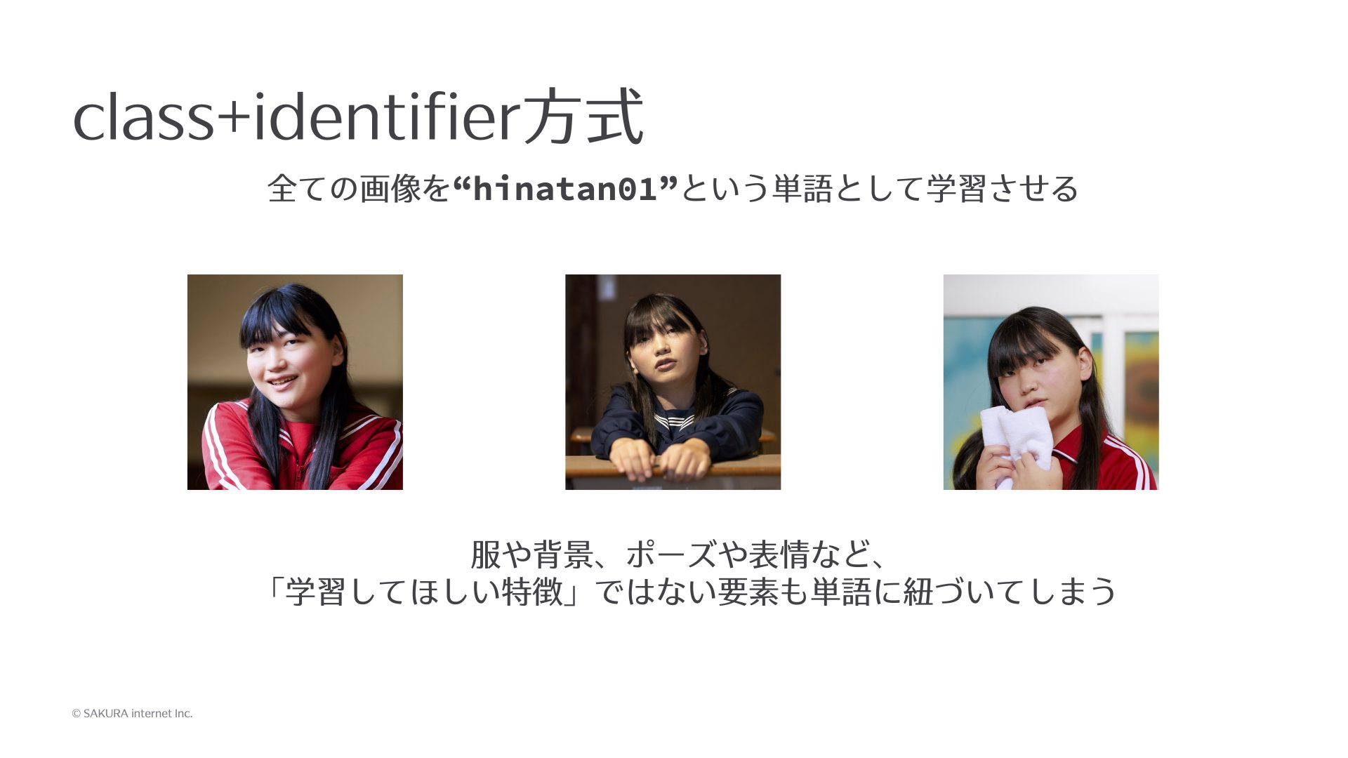 例えばこういう3枚の画像を学習させたいときに、例えばすべての画像に対して、「hinatan01」という単語はこういう特徴だということを学習させるとします。ところがこの方法では、服とか背景とかポーズとか表情とか、あるいはAIに対してこの顔の特徴を学習してくださいとは言ってないので、AIもこれがhinatan01だと言われて、タオルを持ってることかなとか、そういう要素も含まれてしまうことになります。よって、この学習結果を使って画像を生成すると、学習したときの写真に映っていた、本来生成したい物ではない物が出てくるとか、そういった精度の悪化が起きたりします。