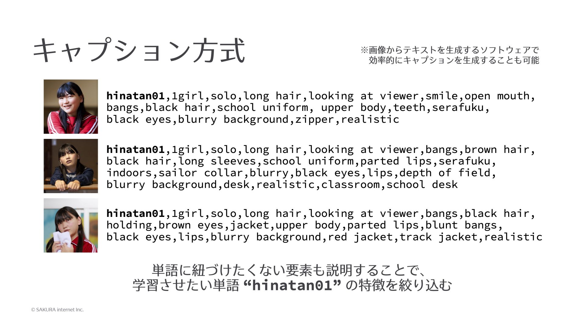 キャプションには、学習させたい単語の要素はもちろん入れておくのですが、それ以外の要素も説明します。例えば女の子1人だとか(1girl)、1人で映っているとか(solo)、髪の毛が長い(long hair)、こちらを見ている(at viewer)、笑っている(smile)、口を開けている(open mouth)、髪の毛が黒色(black hair)、制服を着ている(school uniform)、上半身(upper body)、背景がちょっとボケている(blurry background)など、いろんな特徴のうち、学習させたい単語に紐付かない情報も全部説明します。実際に全部というのは難しいんですが、感覚的にはやれるだけ全部やります。こういうことをすると、学習する時にこれらの要素を取り除いた、残りの特徴っぽいものがこの単語に紐付くことになります。よって、ただ単語を1つ紐付けるよりは精度が良くなります。これがキャプション方式です。