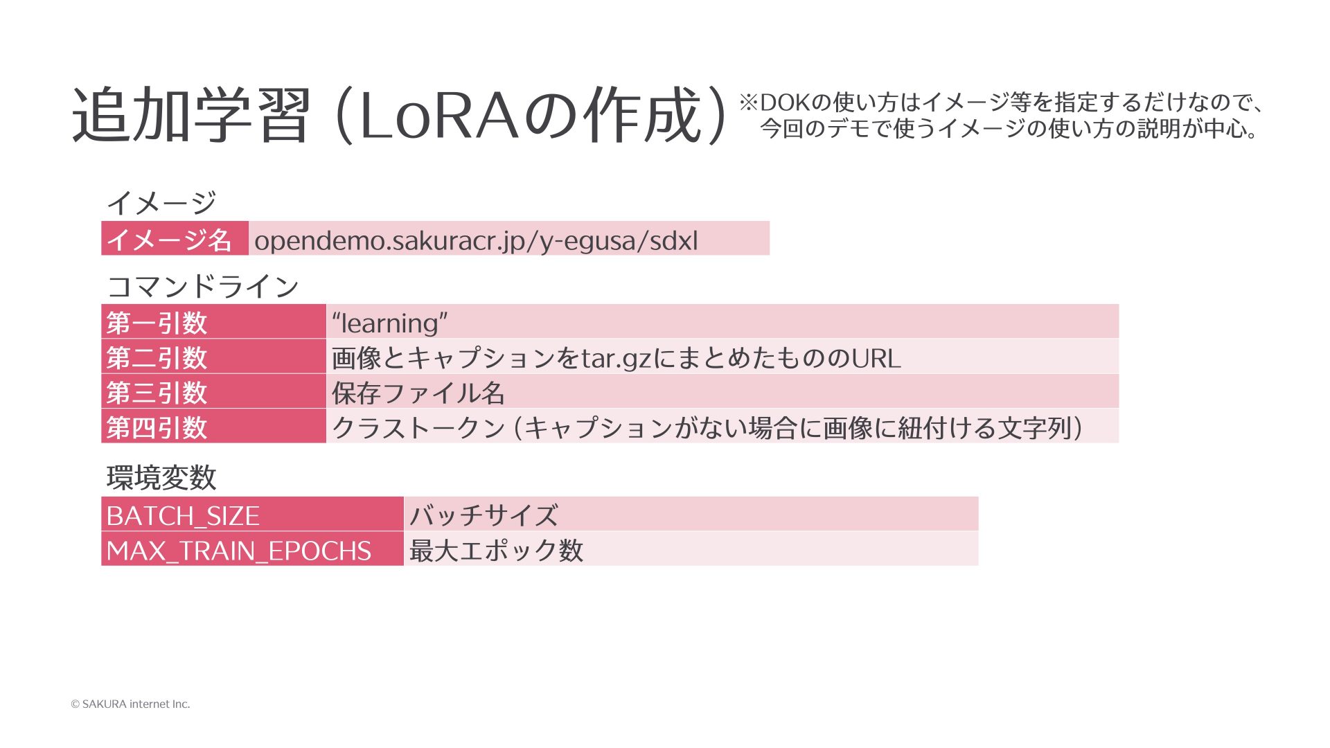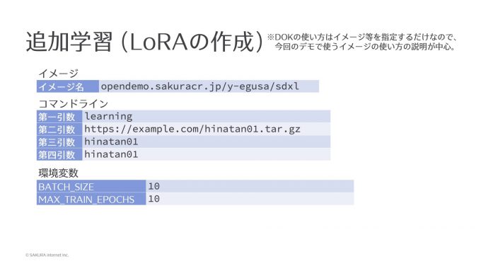 Dockerイメージは先ほどと同じで、今度は引数にlearningと指定します。次に、学習したい画像、今回私は5枚用意しましたが、5枚の画像とキャプションはDockerイメージには含まれていないので、起動時にwgetでウェブサーバから持ってくるというシェルスクリプトにしてあって、学習したい画像とキャプションファイルをtar.gzで固めたものを適当なウェブサーバに置いて、そのURLを第2引数に入れています。第3引数はでき上がったLoRAのファイル名を指定し、第4引数にはキャプションファイルが見つからなかった場合に紐付ける単語も指定できるようにしてますので、この4つを渡します。