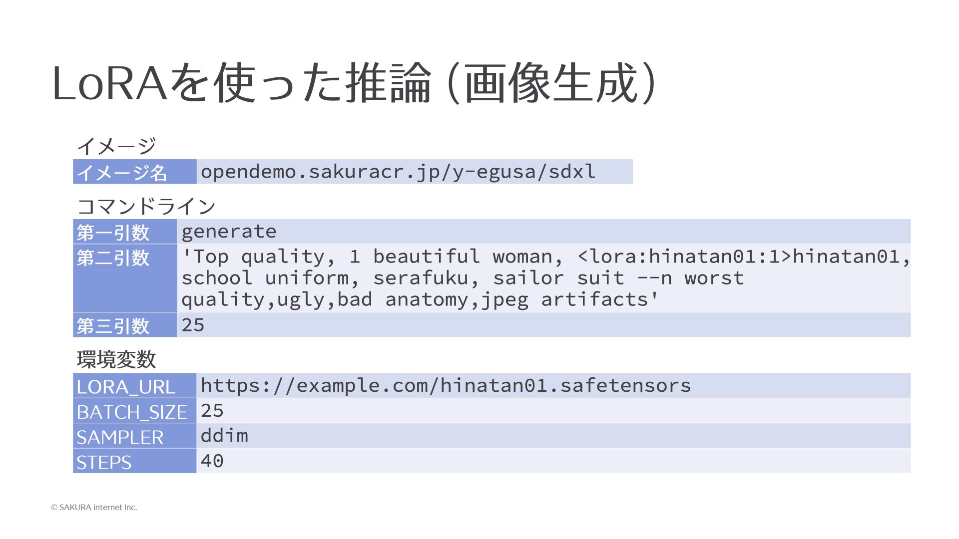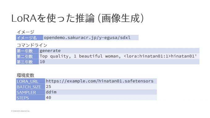 今度は先ほど作ったLoRAを使いたいので、環境変数にそのLoRAのファイルのURLを指定しておくと、それをwgetでダウンロードしてきて使うようにシェルスクリプトを作ってあります。今回実行するコマンドの特徴としては、第2引数において「<lora:hinatan01:1>hinatan01」という記述がありますが、これが「学習した単語を使ってほしい」という意味になります。loraは固定文字列、hinatan01はファイル名で、その後の数値が適用量になります。強く使いたい場合は1、半分ぐらい使ってほしい場合は0.5というように、どれぐらい強くその特徴を使うかを指定して学習時の単語を指定してあげると、先ほどLoRAを作るときに使った単語の特徴が紐付いた形で画像に反映されるということになります。