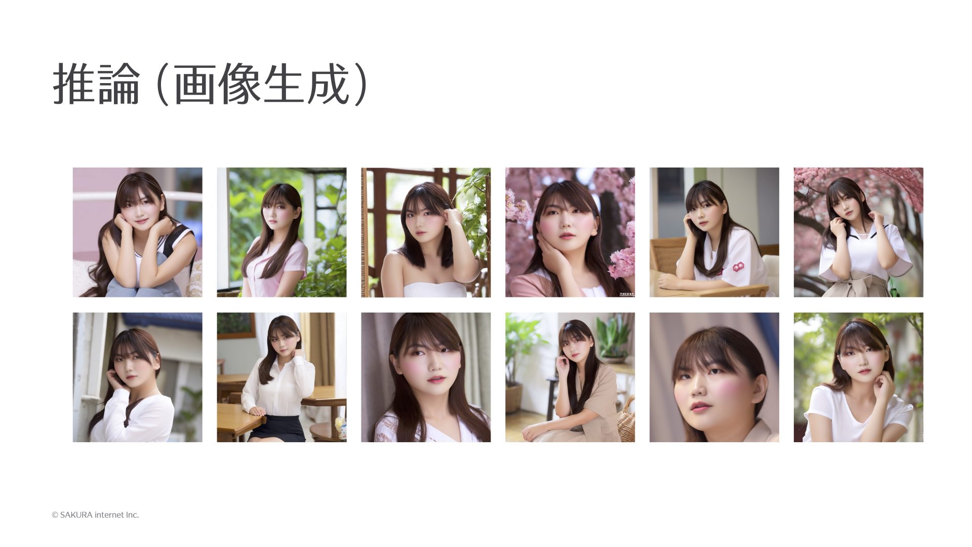 髪の毛が長いとは書いてないのですが、元の学習データが髪の毛が長かった特徴が影響していて、どれも髪の毛が長くなってますね。こんな感じで学習された特徴が利用されています。