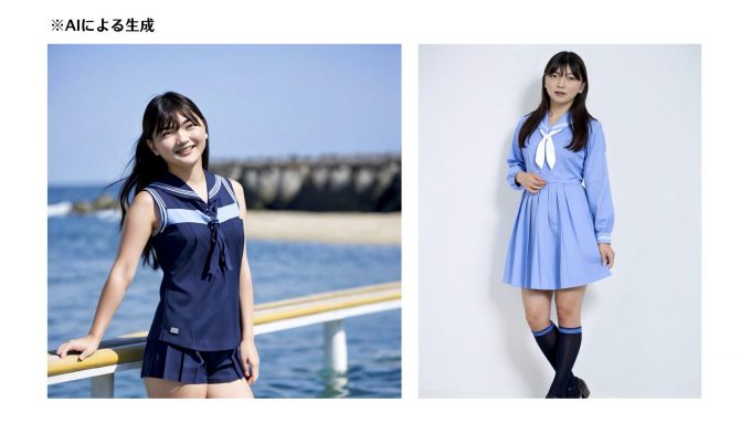 先ほどのプロンプトだと一人の女の子(1 beautiful woman)としか書いてないので、もうちょっと説明を追加します。例えばセーラー服を着ている(sailor suit)などと書くと、ちゃんと下図のようにセーラー服を着た状態で出てきます。