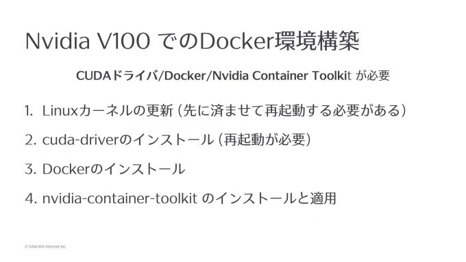 まず最初に、Linuxカーネルを最新版にしておく必要があります。最新である必要はないのですが、アップデートするとドライバーが動かなくなることがあるので、先にアップデート済ませておきます。次はcuda-driverというGPUのドライバーをインストールします。これも入れた後で再起動が必要です。それからDockerを普通にインストールして、nvidia-container-toolkitという、Dockerのコンテナの中でもGPUが使えるようになるというツールを入れると、GPUを使ってDockerのイメージを、手元のPCや借りたサーバなどで実行できるようになります。