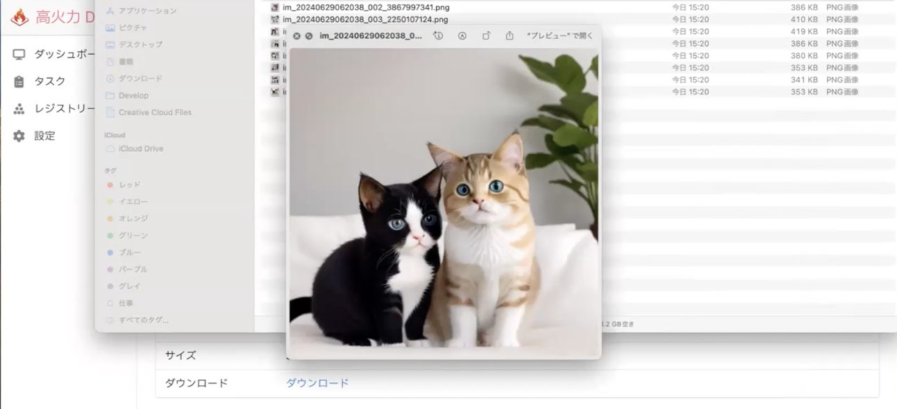 先ほどタスクを実行した猫の画像生成処理も終わっているようなので結果を見てみましょう。実行が終わった後のファイルが保管されていて、あとでダウンロードできるというのが高火力 DOKの便利なポイントですね。