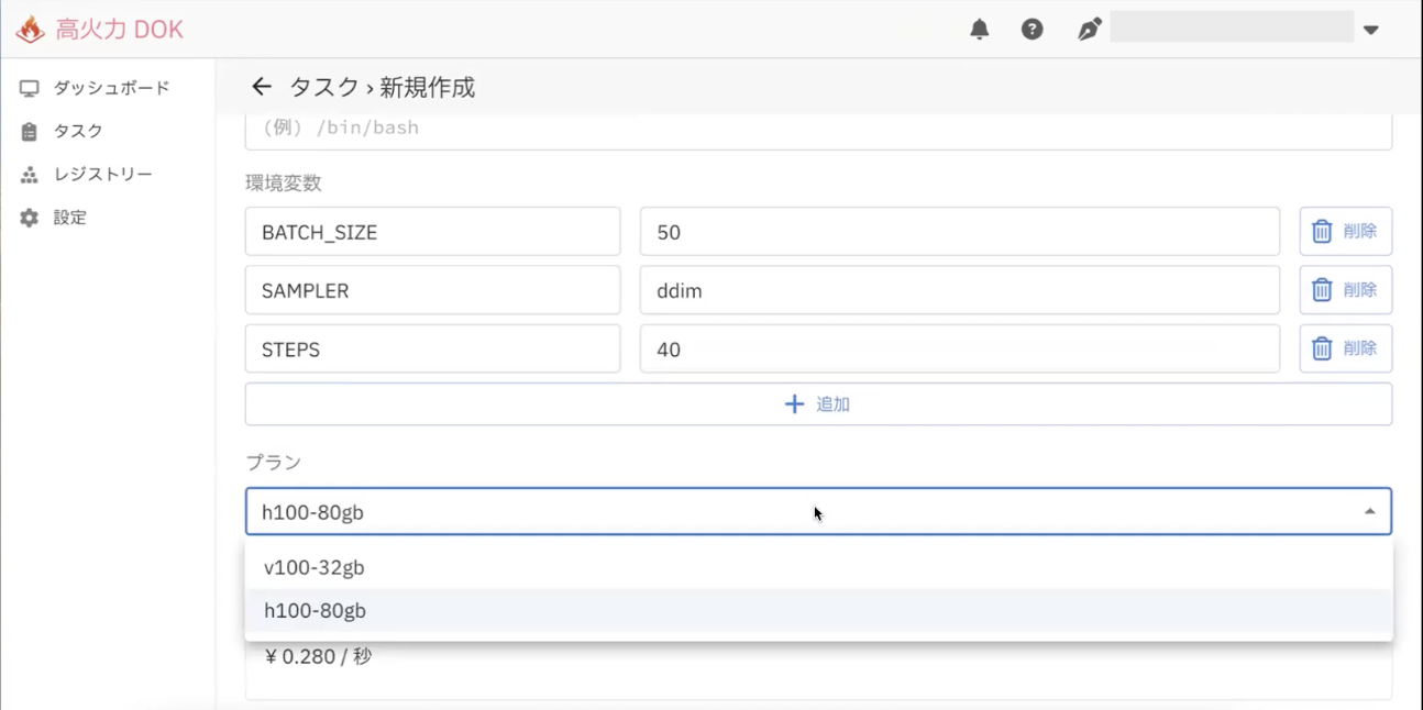 手元の高火力 DOKの環境でも実行できますが、処理に時間がかかるので先に実行しておきます。高火力 DOKでは、過去のタスクからコピーして新規タスクを作成できます。それから、現在はGPUはV100のみ提供でH100は利用できないんですが、H100も提供に向けて準備中で、私の開発環境ではH100も使えるので、ここでは使ってみます。