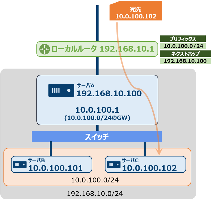 例: 192.168.10.0/24ネットワーク内に別の10.0.100.0.24ネットワークが構築されていて、2つのインタフェースを持つ「サーバA」に対してスタティックルートを設定する場合