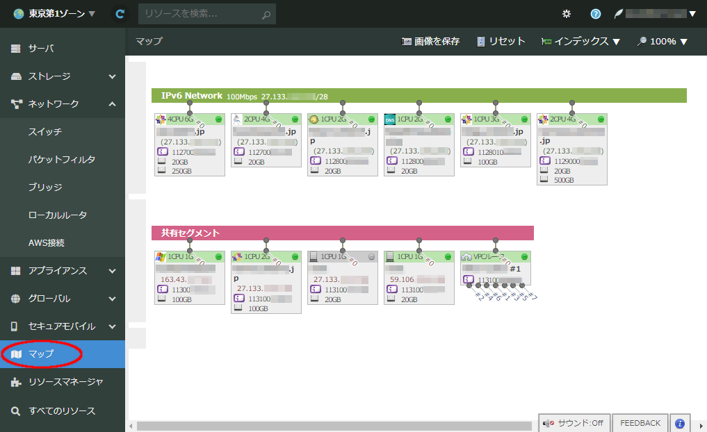 コントロールパネル左側のメニューより「マップ」をクリックします。左側に現在選択中のゾーンの接続マップが表示されます。