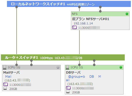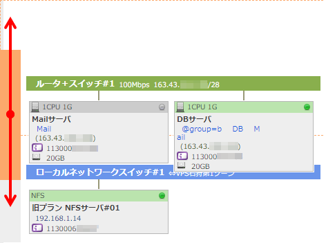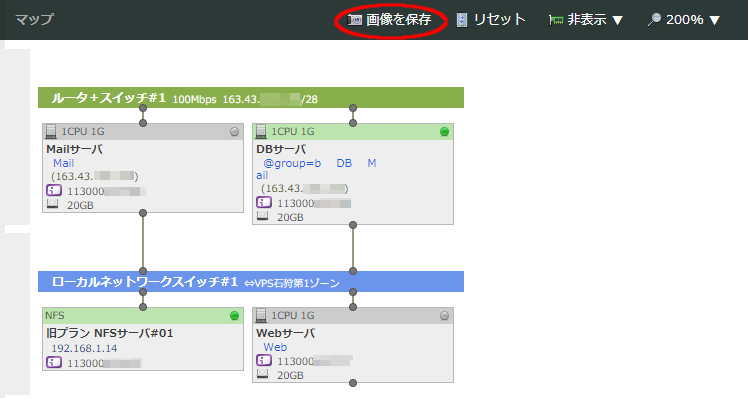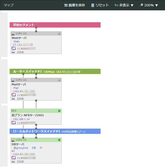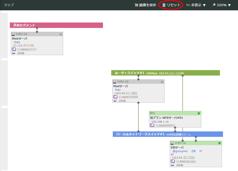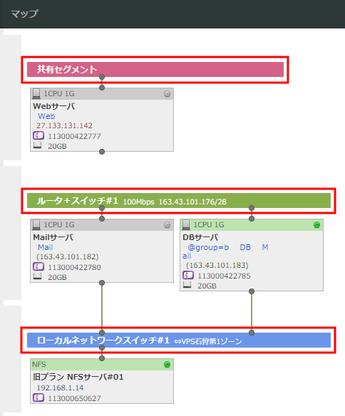 で色分けされます。また、それぞれのスイッチ/ネットワークに回線速度や割当IPアドレスブロック、名前が表示されます。