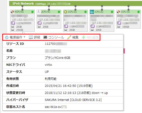 | IPv4アドレス | NICに割り当てられたIPv4アドレスを表示します。 ※サーバの場合「NIC」タブで 割当IPアドレスの設定 が予め行われている必要があります |