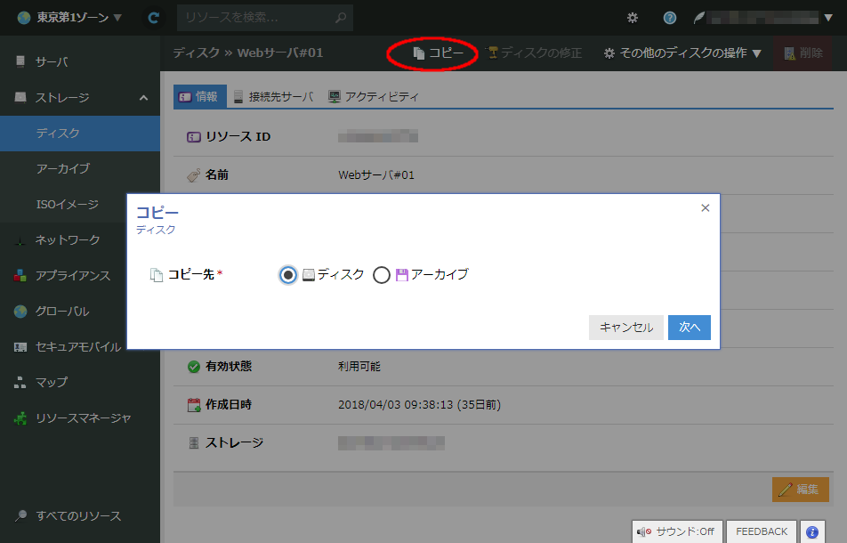 作成済みのディスクをバックアップする方法には、同じくディスクに同様の内容をコピーする「ディスクコピー」と、すぐにサーバに接続して使用しない場合に安価にデータ保管ができる アーカイブ へコピーする「アーカイブコピー」があります。いずれもディスク詳細画面内の「コピー」ボタンから使用できます。