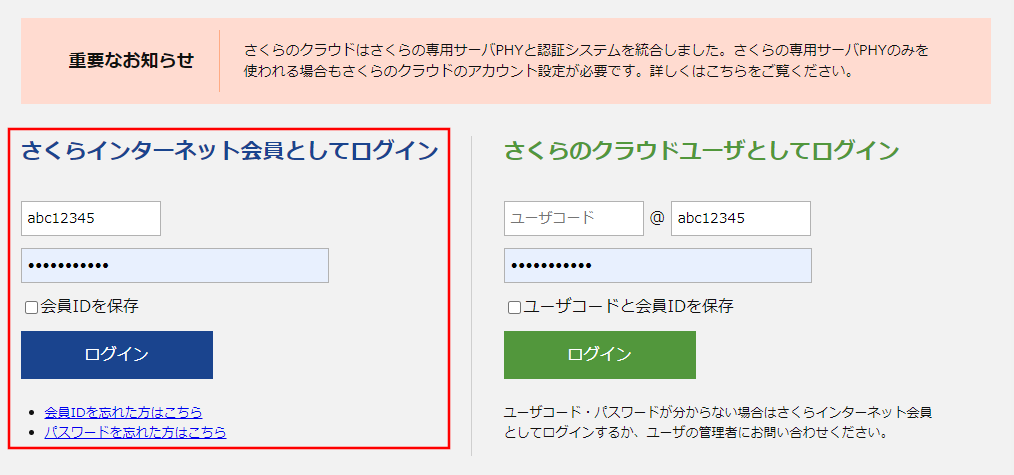 さくらインターネットのサービスを利用するにあたり、会員の氏名や住所などの属性や支払先の管理用として、さくらインターネットの「会員ID」を使用しています。お持ちでない場合は 会員登録 を行い、会員IDを取得してください。