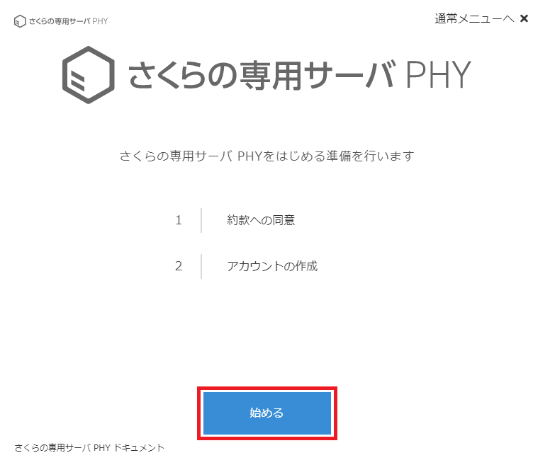 さくらの専用サーバPHYをまだ利用していない会員IDでコントロールパネルにログインすると以下の画面が表示されます。アカウントを作成するため、画面の内容を確認後「始める」をクリックしてください。