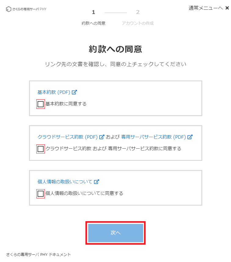 各約款/個人情報取り扱いに関するポリシーを確認し、同意する場合は各項目のチェックを有効にして「次へ」をクリックします。