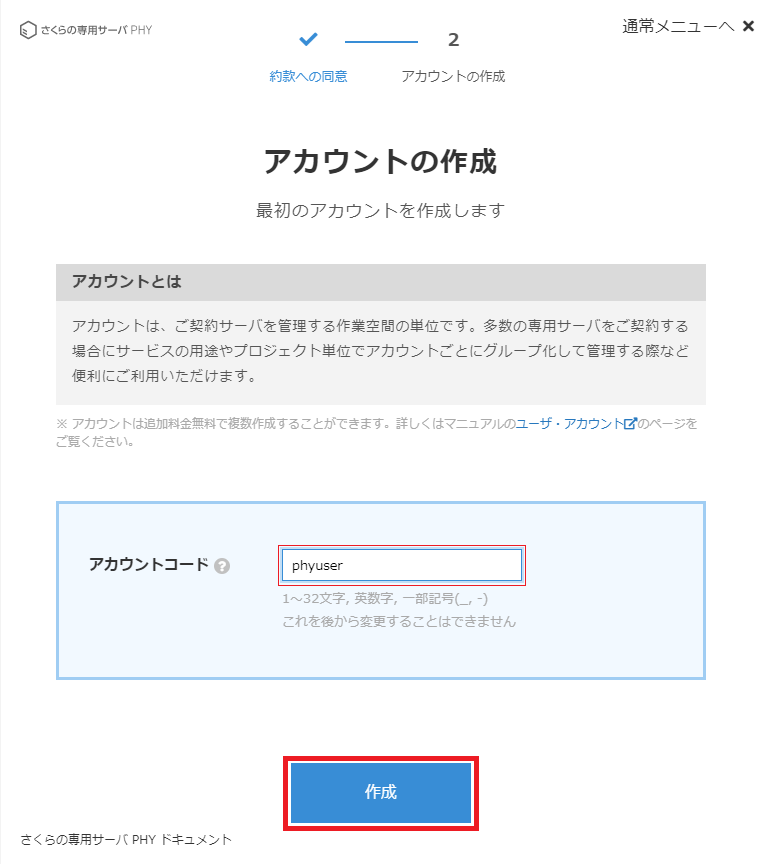 アカウントコードに任意の名前を入力し、「作成」をクリックします。