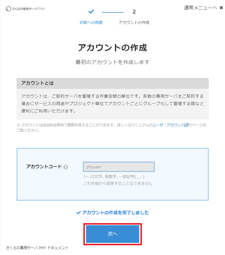アカウントの作成完了後、「次へ」をクリックします。