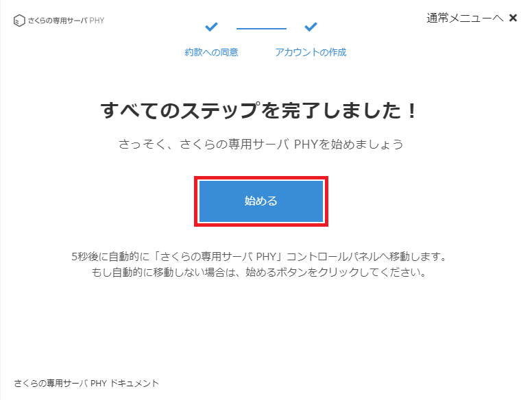 全ての手順が完了するとPHYの利用が可能となります。「始める」をクリックするとコントロールパネル画面へ移動します。