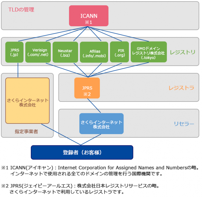 さくらインターネットもリセラーということですね。さくらインターネットで取り扱っているTLDについて、図で表すと下記のとおりです。