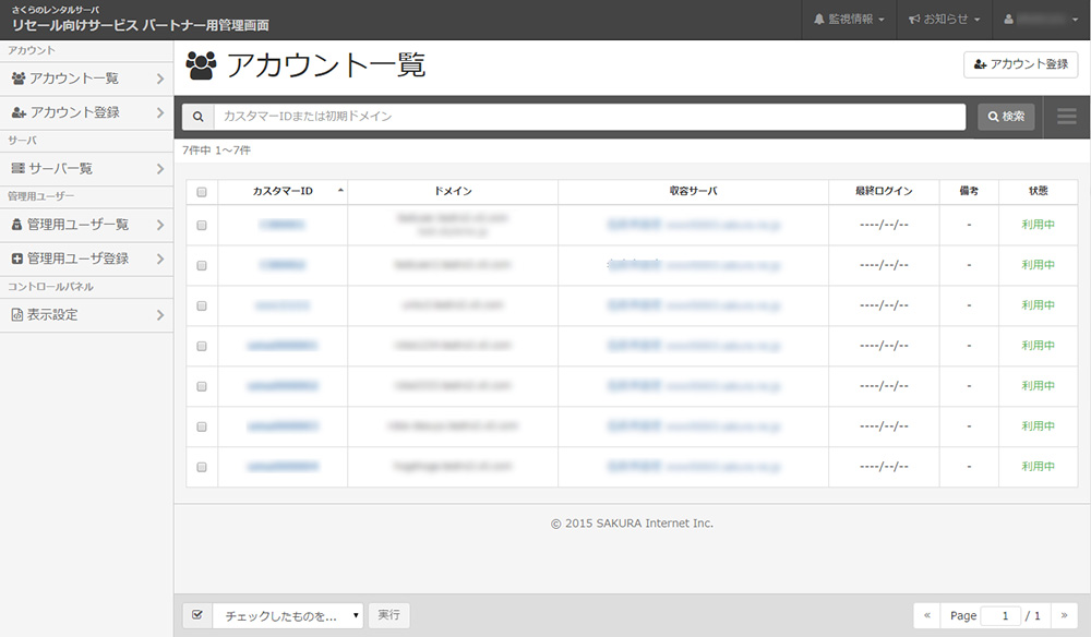 アカウント一覧・検索・状態表示 サービスサーバー内のユーザ一覧と検索機能