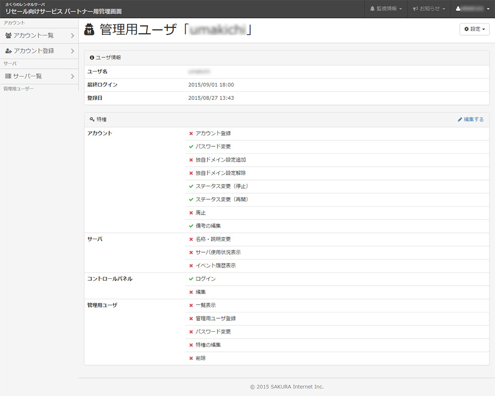 管理用ユーザ 管理用ユーザを新たに発行し管理画面上の機能操作を制限するなどすることができます。